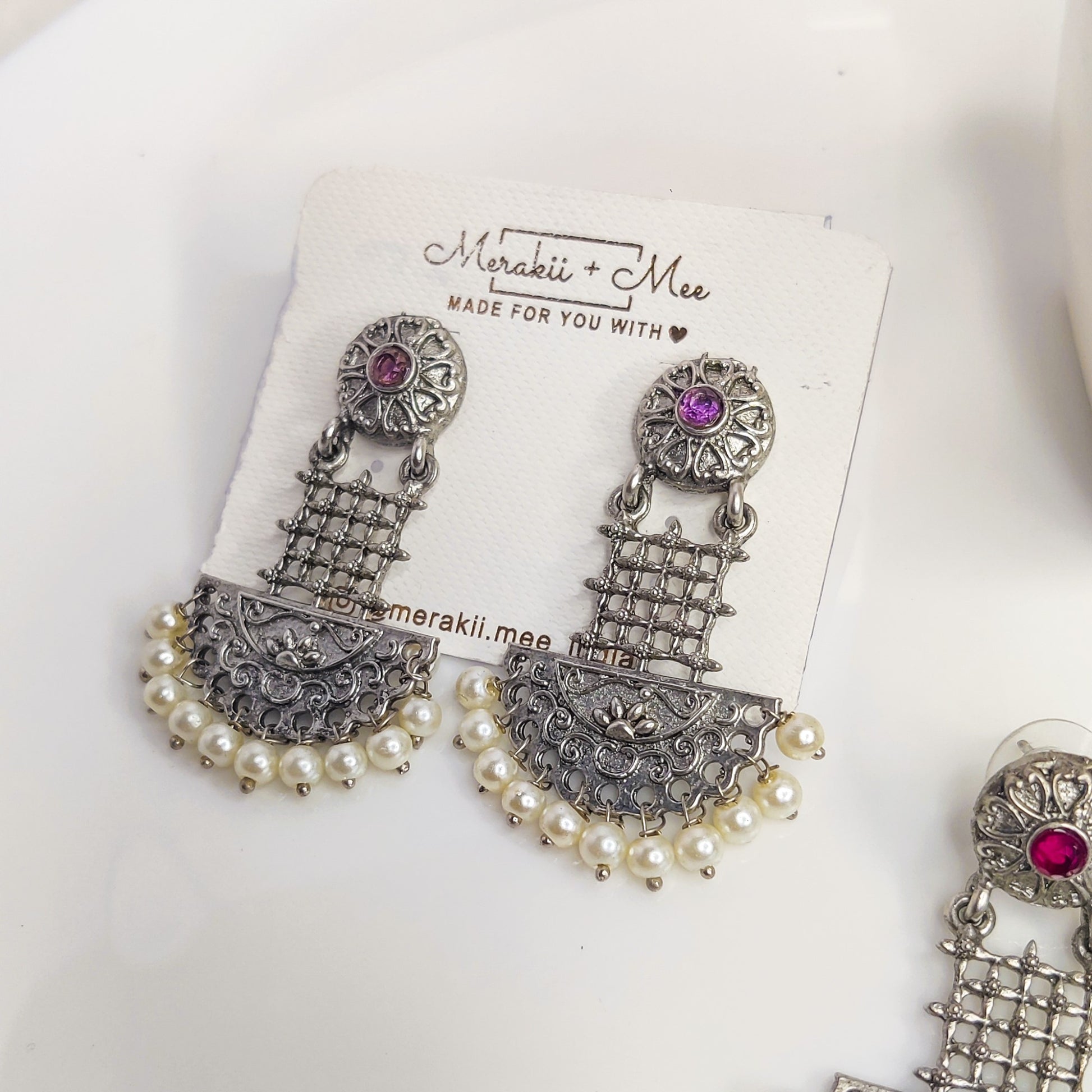 The Silver Lookalike Brass Oxidized Dangler Earring! With its unique silver color and sleek design, this earring will add a touch of sophistication to any outfit. The perfect finishing touch for a night out or a special occasion, the Silver Lookalike Brass Oxidized Dangler Earring is sure to become your new go-to accessory.