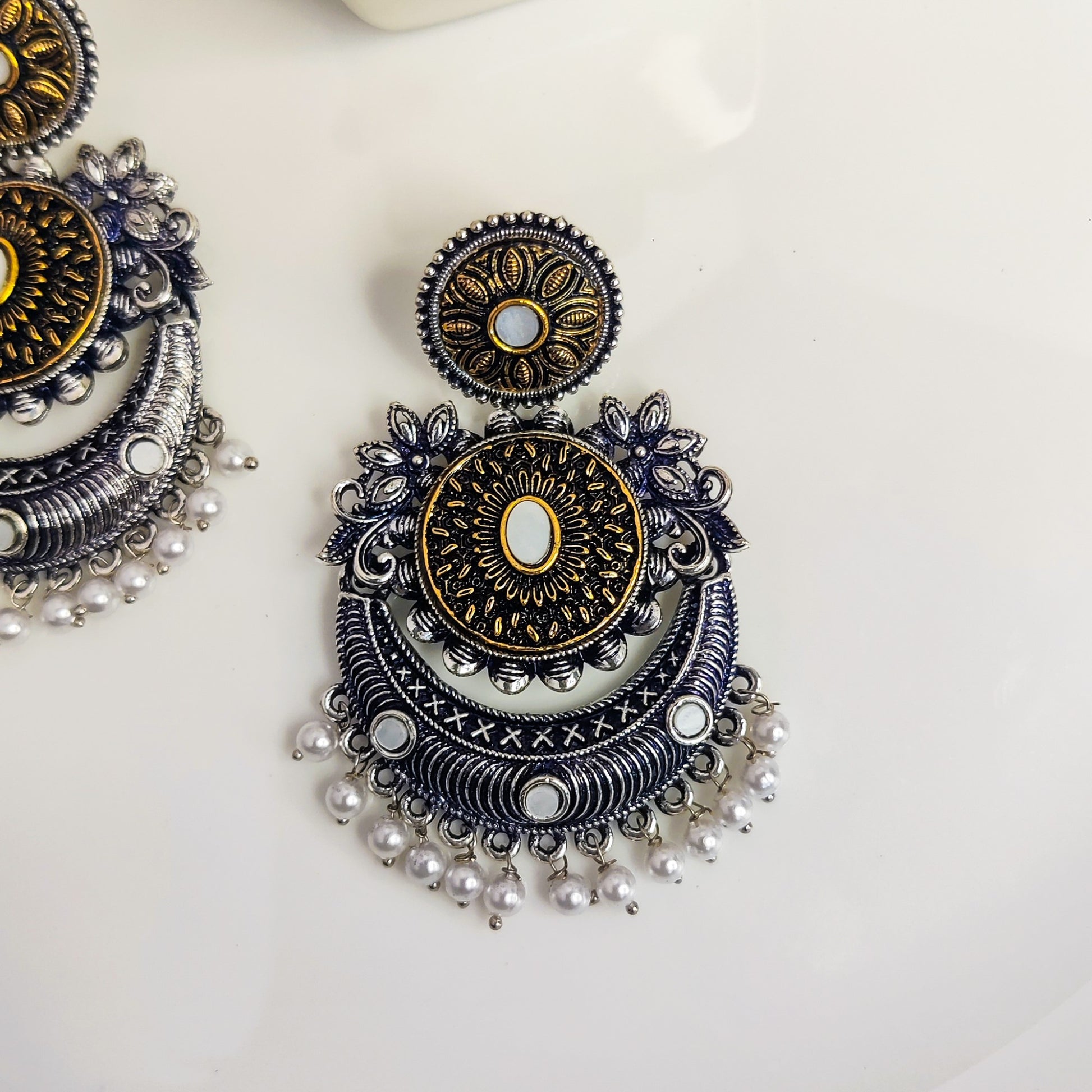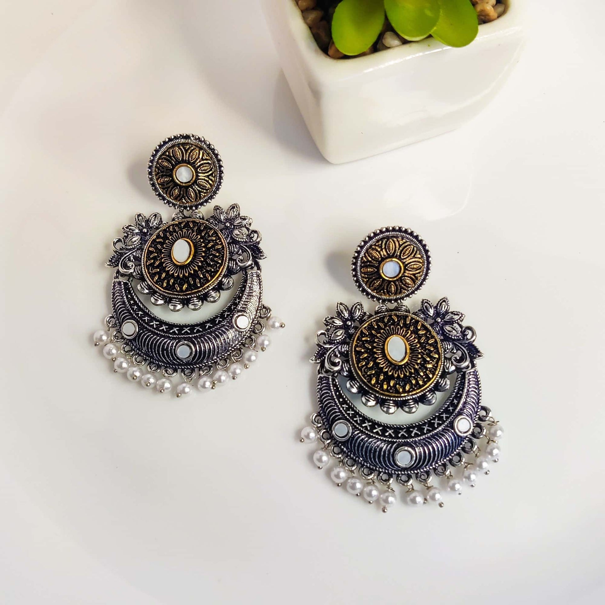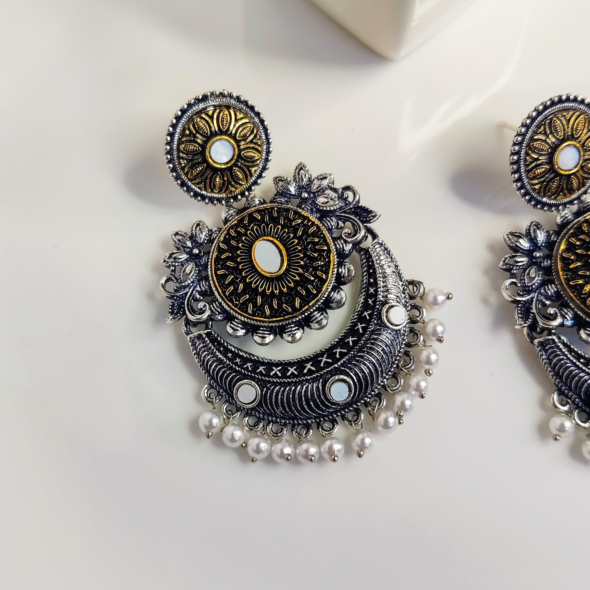 black pearl earrings, vintage chandelier earrings, teardrop dangle earrings, gold filigree jewelry, baroque pearl accessories, onyx drop earrings, statement fashion jewelry, aristocratic style earpieces, regal accessory collection, midnight elegance adornments, handcrafted earrings, ethnic jewelry, traditional earrings, silver-tone earrings, red and yellow earrings, South Asian jewelry, ornate earrings, premium quality earrings, ethnic fashion jewelry, unique earrings